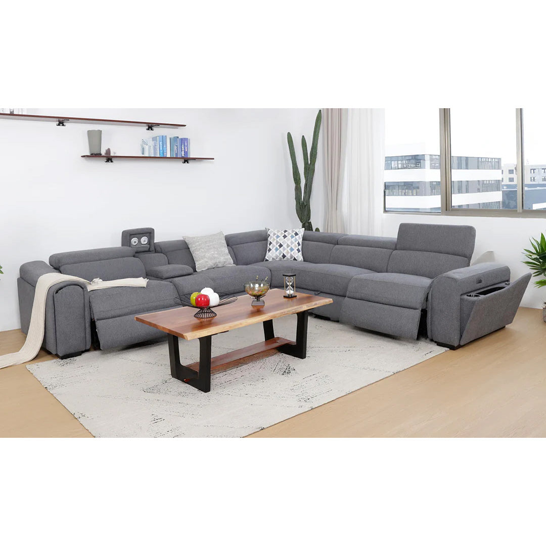 Discover the Everlyn Corner lounge —where luxury meets intelligent design. This six-piece modular system transforms any living space with electric end recliners featuring pull-out storage arms, cup holders, and power outlets. The stylish wedge console offers ambient lighting, additional cup holders, and power outlets, while the fixed chair includes hidden pullout storage for blankets and cushions. Choose between sophisticated dark grey fabric or durable tan synthetic leather to suit your décor. At 3390W x 3040D x 770H, the Everlyn adapts to your room layout, delivering the comfort and functionality your home truly deserves.