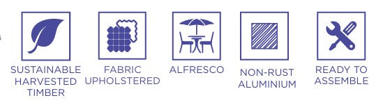 • Sunproof brand fabric upholstered cushions are finished with piped edges